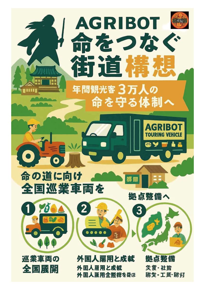 This project integrates agriculture, tourism, and disaster prevention starting from Mount Fuji, inspired by the ancient mythology concept of "Tokoyo"—an ideal land where life continuously circulates. ICS resonates with this philosophy and proposed the name "AGRIBOT" for the agricultural touring vehicle.